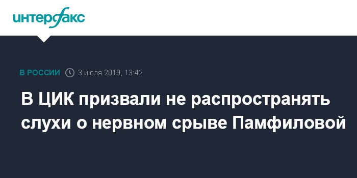 Москва. 3 июля. INTERFAX.RU - Зампредседателя Центризбиркома Николай Булаев опроверг информацию анонимного телеграм-канала о то, что глава комиссии Элла Памфилова в июне была госпитализирована из-за нервного срыва, случившегося из-за муниципальных выборов в Петербурге. Он призвал не распространять слухи о причинах ее долгого отсутствия на работе.