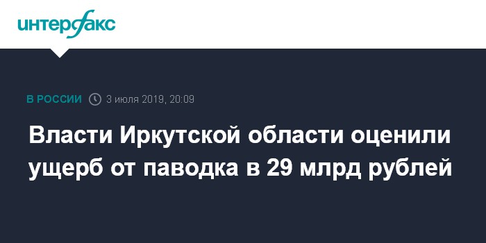 Москва. 3 июля. INTERFAX.RU - Предварительный ущерб от паводка в Иркутской области составил 29 млрд рублей, сообщает пресс-служба правительства региона со ссылкой на губернатора Сергея Левченко.