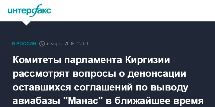 Законопроекты о денонсации соглашений с 11-ю странами коалиции поступили в киргизский парламент 14 февраля, а 19 февраля парламент денонсировал базовое соглашение о размещении авиабазы "Манас", заключенное с США.