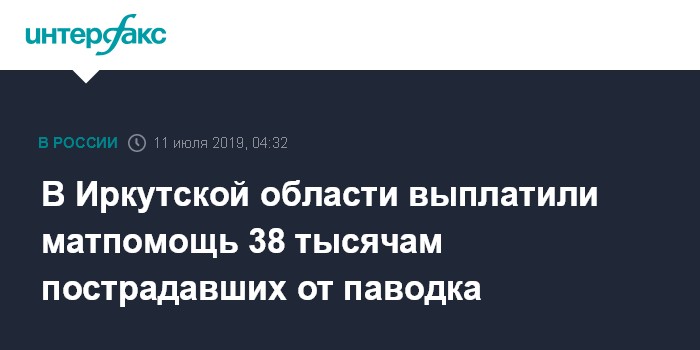 Москва. 11 июля. INTERFAX.RU - Единовременную материальную помощь в размере 10 тысяч рублей получили более 38 тысяч жителей Иркутской области, пострадавших от наводнения, сообщает пресс-служба правительства региона.