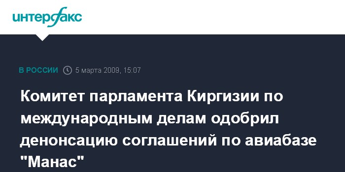 Москва. 5 марта. INTERFAX.RU - Комитет парламента Киргизии по международным делам одобрил предложение правительства о денонсации соглашений с 11 странами антитеррористической коалиции, разместивших своих военнослужащих на авиабазе "Манас" в аэропорту Бишкека. За данное решение в четверг проголосовало большинство членов комитета.