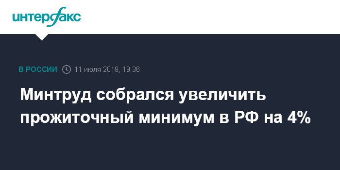 Москва. 11 июля. INTERFAX.RU - Министерство труда и социальной защиты намерено повысить прожиточный минимум трудоспособного населения в России на 4,1% по итогам II квартала 2019 года.