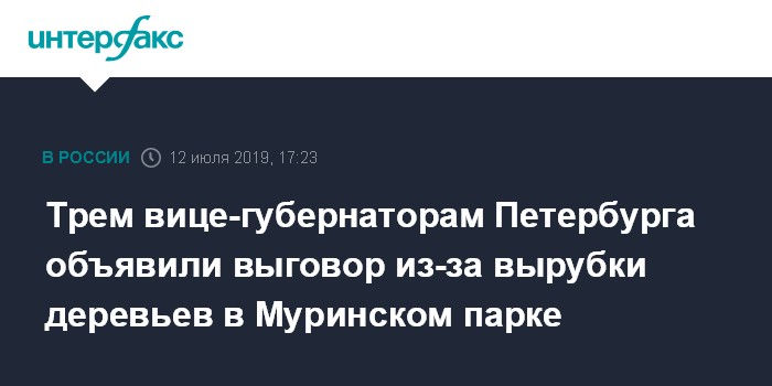 Москва. 12 июля. INTERFAX.RU - Врио губернатора Санкт-Петербурга Александр Беглов объявил выговор трем вице-губернаторам, допустившим сокращение площади Муринского парка для строительства спорткомплекса, сообщила пресс-служба Смольного в пятницу.
