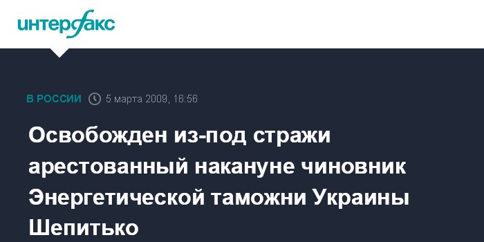 Москва. 5 марта. INTERFAX.RU - В рамках выполнения решения Шевченковского суда Киева о приостановлении следственных действий по делу вокруг НАК "Нафтогаз Украины" из-под стражи освобожден заместитель начальника отдела Энергетической региональной таможни Государственной таможенной службы Тарас Шепитько.