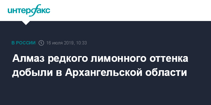 Москва. 16 июля. INTERFAX.RU - Алмаз крайне редко встречающегося глубокого лимонного оттенка и ювелирного качества массой 47,6 карата добыт на месторождении имени В.Гриба АО "АГД Даймондс" в Мезенском районе Архангельской области.