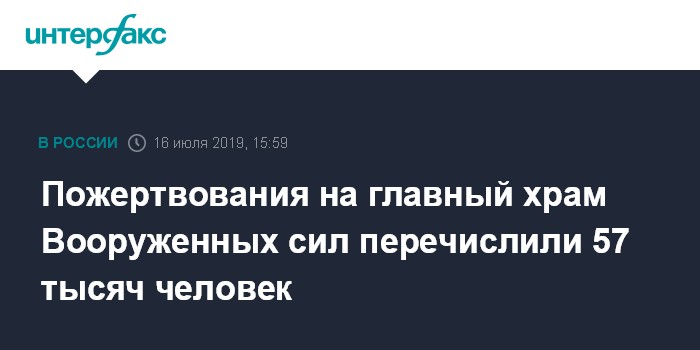 Москва. 16 июля. INTERFAX.RU - Около 57 тысяч человек передали пожертвования на строительство главного храма Вооруженных сил России в Кубинке, всего на него собрали 2 525 657 000 рублей. Это сообщил гендиректор фонда "Воскресение" Александр Каньшин.