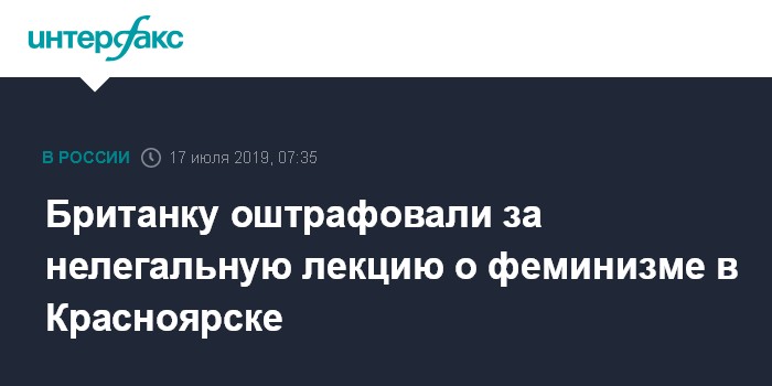 Москва. 17 июля. INTERFAX.RU - Гражданка Великобритании не имела права публично выступать в Красноярске с лекцией о феминизме, потому что въехала в РФ по туристической визе, сообщает пресс-служба управления МВД по Красноярскому краю.