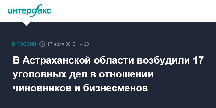 Москва. 17 июля. INTERFAX.RU - В Астраханской области возбуждены 17 уголовных дел в отношении чиновников и бизнесменов. Об этом сообщает следственное управление СКР по региону в среду.