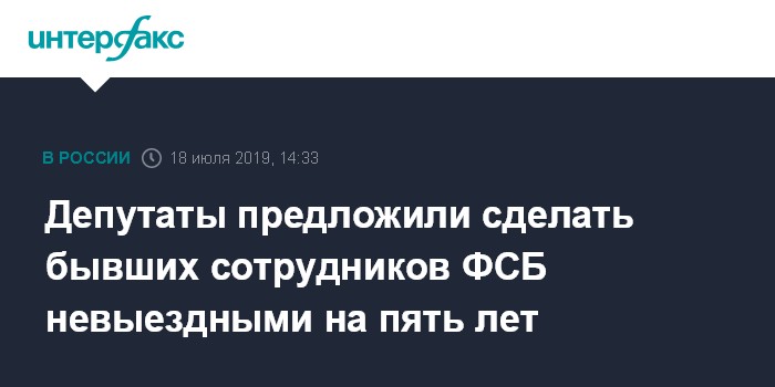 Москва. 18 июля. INTERFAX.RU - В Госдуму внесли законопроект о запрете сотрудникам ФСБ выезжать за границу в течение пяти лет после увольнения из спецслужбы. Эта мера призвана защитить бывших сотрудников ФСБ от преследования и провокаций, говорится в пояснительной записке к документу.