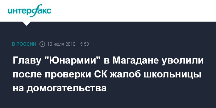 Москва. 18 июля. INTERFAX.RU - В Магадане Следственный комитет завершил доследственную проверку публикации о том, что руководитель местной молодежной военно-патриотической организации приставал к несовершеннолетней. По представлению СК и после служебной проверки мужчину уволили из МОГАУ "Молодежный центр" за "аморальный поступок", не совместимый с должностью специалиста по работе с молодежью.