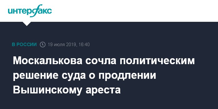 Москва. 19 июля. INTERFAX.RU - Уполномоченный по правам человека Татьяна Москалькова назвала политическим решение украинского суда о продлении ареста главному редактору "РИА Новости - Украина" Кириллу Вышинскому.