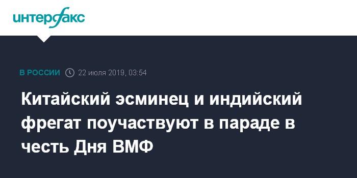 Москва. 22 июля. INTERFAX.RU - Китайский эсминец "Сиань" и индийский фрегат "Таркаш" примут участие в Главном военно-морском параде, который состоится в Санкт-Петербурге 28 июля, сообщает в понедельник официальная газета Вооруженных сил РФ "Красная звезда".