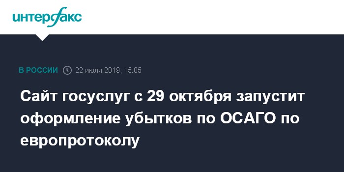 Москва. 22 июля. INTERFAX.RU - С 29 октября 2019 года через портал госуслуг можно будет оформлять убытки в ОСАГО, которые оформляются без вызова представителя дорожной полиции (по европротоколу). Об этом сообщила пресс-служба Банка России.