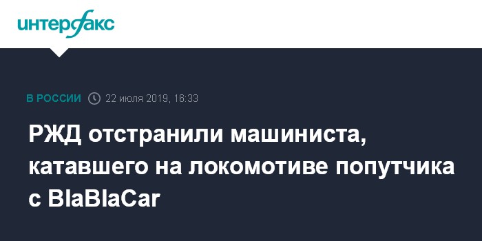 Москва. 22 июля. INTERFAX.RU - Машинист поезда, возивший из Петербурга в Москву попутчиков с сервиса BlaBlaCar, отстранен от работы, сообщает в понедельник издание "Фонтанка" со ссылкой на пресс-службу Октябрьской железной дороги.