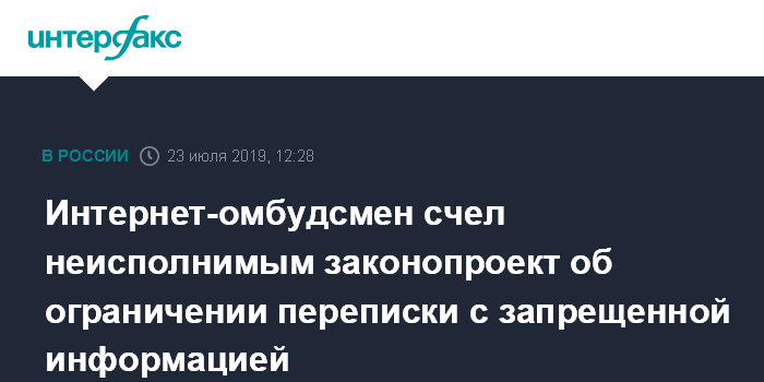 Москва. 23 июля. INTERFAX.RU - Интернет-омбудсмен Дмитрий Мариничев считает, что в нынешнем виде законопроект, обязывающий организаторов сервисов электронной почты ограничивать передачу электронных сообщений, которые содержат информацию, распространение которой в России запрещено, не может быть принят.