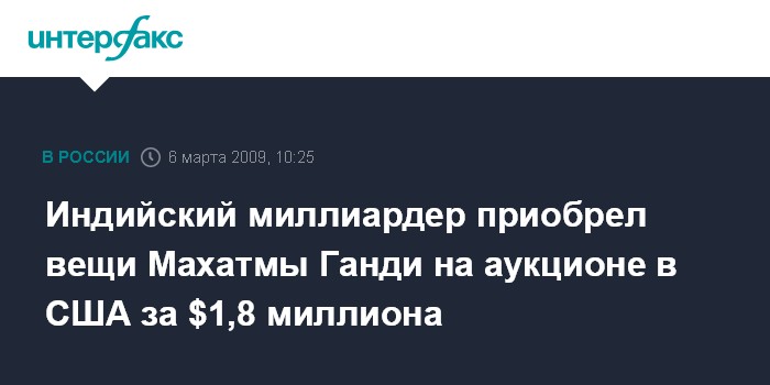 Москва. 6 марта. INTERFAX.RU - Председатель индийской компании "Ю-Би Групп" - миллиардер Виджай Маллия - за $1,8 млн приобрел на аукционе в Нью-Йорке личные вещи индийского революционера Махатмы Ганди, сообщает американская телекомпания CNN.