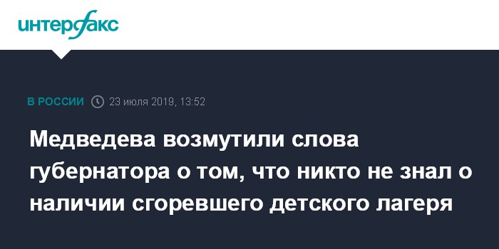 Москва. 23 июля. INTERFAX.RU - Премьер-министр РФ Дмитрий Медведев выразил возмущение заявлением губернатора Хабаровского края Сергея Фургала о том, что "никто не знал" о сгоревшем палаточном лагере.