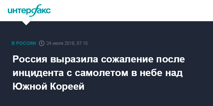 Москва. 24 июля. INTERFAX.RU - Представитель южнокорейского президента Юн До Хан заявил, что российская сторона "выразила глубокое сожаление" в связи с инцидентом, произошедшим в минувший вторник с российским бомбардировщиком.