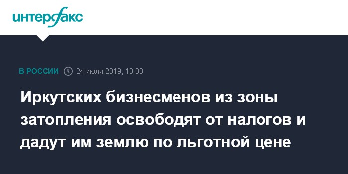 Москва. 24 июля. INTERFAX.RU - Правительство Иркутской области освободит от налогов за 2019 год предпринимателей из зоны затопления, сообщила пресс-служба правительства региона по итогам встречи губернатора Сергея Левченко с министром строительства и ЖКХ РФ Владимиром Якушевым.