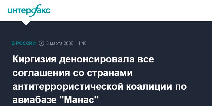 Москва. 6 марта. INTERFAX.RU - Парламент Киргизии в пятницу принял решение о денонсации межправительственных соглашений с одиннадцатью странами антитеррористической коалиции, размещавших своих военнослужащих на авиабазе "Манас".