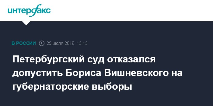 Москва. 25 июля. INTERFAX.RU - Санкт-Петербургский городской суд отклонил иск депутата городского Законодательного собрания Бориса Вишневского, который оспаривал отказ горизбиркома зарегистрировать его кандидатом в губернаторы. Об этом сообщила объединенная пресс-служба городских судов.