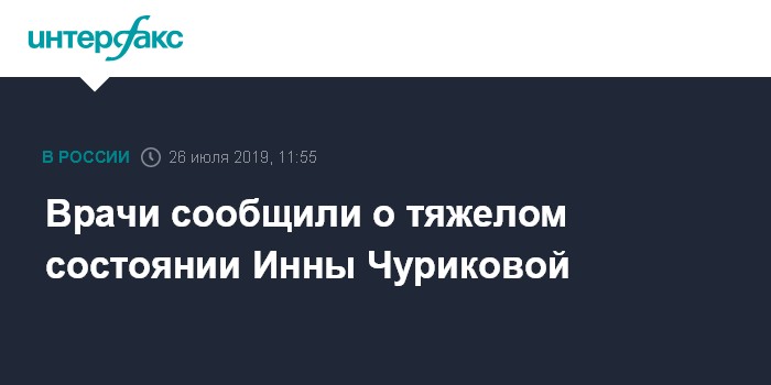 Москва. 26 июля. INTERFAX.RU - Актриса Инна Чурикова все еще находится в тяжелом состоянии. Об этом "Интерфаксу" рассказали в НИИ скорой помощи имени Склифосовского.
