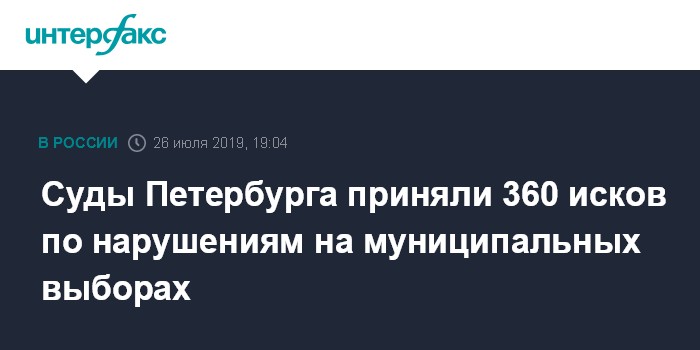 Москва. 26 июля. INTERFAX.RU - Суды в Петербурге приняли 360 исковых заявлений по нарушениям на муниципальных выборах.