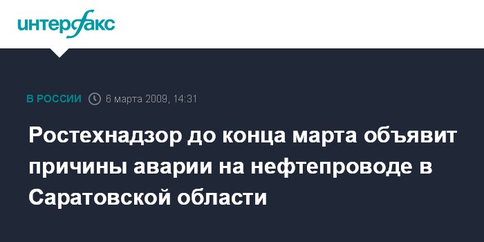 Москва. 6 марта. INTERFAX.RU - Ростехнадзор до конца марта объявит причины аварии на нефтепроводе в Саратовской области, сообщил журналистам глава Ростехнадзора Николай Кутьин.