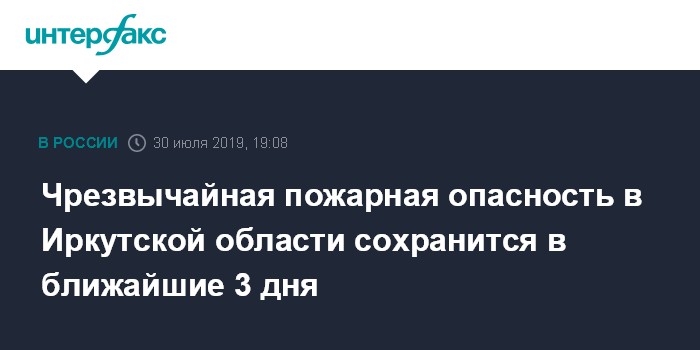 Москва. 30 июля. INTERFAX.RU - Чрезвычайная пожарная опасность сохранится в ближайшие три дня в Иркутской области, где ранее был введен режим чрезвычайной ситуации, сообщили в Гидрометцентре РФ.