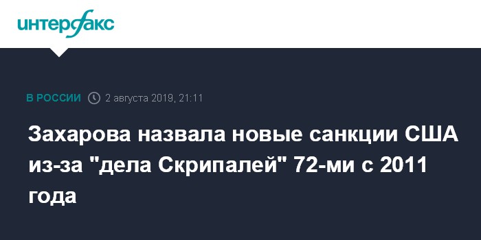 Москва. 2 августа. INTERFAX.RU - Второй пакет санкций из-за "дела Скрипалей", которые президент США Дональд Трамп ввел 1 августа, стали 72-ми для России с 2011 года, заявила представитель МИД Мария Захарова. Она констатировала, что эти санкции обречены, как и все предшествующие.