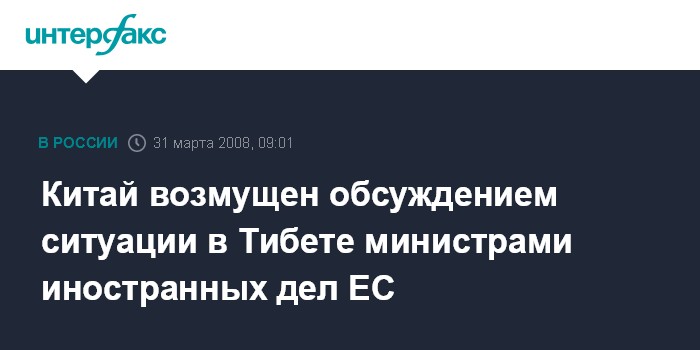 Пекин. 31 марта. INTERFAX.RU - Официальный представитель МИД КНР Цзян Юй выразила "крайнее неудовлетворение" Китая тем, что министры иностранных дел стран ЕС на неофициальном заседании в Словении в минувшее воскресенье обсуждали вопрос о Тибете и приняли соответствующую резолюцию.