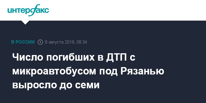 Москва. 6 августа. INTERFAX.RU - Число погибших в ДТП с участием микроавтобуса под Рязанью достигло семи человек, сообщили "Интерфаксу" в пресс-службе областного Минздрава региона. Ранее сообщалось о шести жертвах аварии.