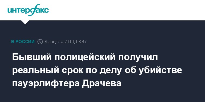 Москва. 6 августа. INTERFAX.RU - Хабаровский краевой суд приговорил к реальному сроку бывшего полицейского Владимира Овчинникова, который не предотвратил убийство пауэрлифтера Андрея Драчева в августе 2017 года, сообщил адвокат семьи погибшего Евгений Шевцов.