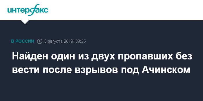 Москва. 6 августа. INTERFAX.RU - Один человек все еще числится пропавшим без вести после пожара и взрывов на территории арсенала воинской части в Ачинском районе Красноярского края, сообщил журналистам губернатор региона Александр Усс во вторник после заседания оперативного штаба.