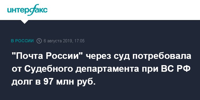Москва. 6 августа. INTERFAX.RU - "Почта России" подала иск в Арбитражный суд Москвы о взыскании задолженности в размере 97,1 млн рублей с Судебного департамента при Верховном суде РФ, следует из картотеки арбитражных дел.