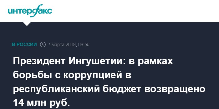 Магас. 7 марта. ИНТЕРФАКС-ЮГ - В ходе проведения антикоррупционных мероприятий в Ингушетии в бюджет республики Ингушетия возвращено 14 млн руб., заявил в субботу агентству "Интерфакс-Юг" президент республики Ингушетия Юнус-Бек Евкуров.