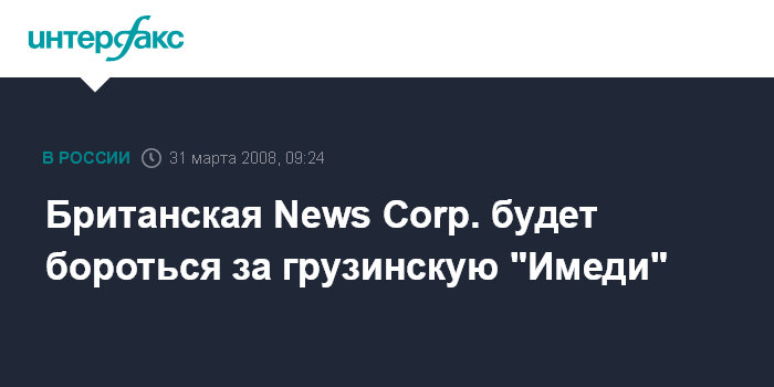 Тбилиси. 31 марта. INTERFAX.RU - Британская News Corp. готова через суд бороться за права на грузинскую телекомпанию "Имеди", на которую претендуют также родственники скоропостижно скончавшегося предпринимателя Бадри Патаркацишвили, говорится в заявлении руководства медиа-холдинга, распространенном грузинскими СМИ.