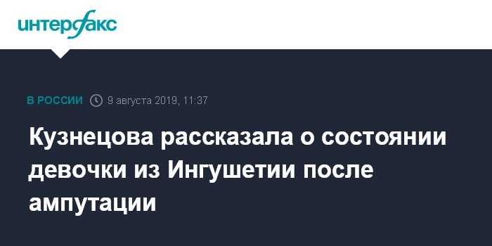 Москва. 9 августа. INTERFAX.RU - Девочка из Ингушетии, подвергавшаяся жестокому обращению в семье тети, после ампутации правой руки ведет себя активно, сообщила уполномоченный при президенте РФ по правам ребенка Анна Кузнецова.