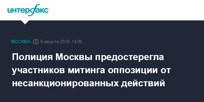 Москва. 9 августа. INTERFAX.RU - Полиция Москвы сообщила о призывах участвовать в несанкционированных акциях в центре города 10 августа, хотя там согласовали митинг на проспекте Академика Сахарова. Ведомство напомнило об ответственности за такие призывы и участие в несогласованных мероприятиях.