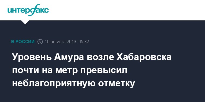 Москва. 10 августа. INTERFAX.RU - Уровень реки Амур в районе Хабаровска, по данным на утро субботы, составил 525 см, превысив неблагоприятную отметку на 75 см, сообщила пресс-служба Главного управления МЧС по Хабаровскому краю.