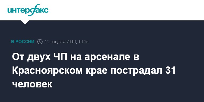 Москва. 11 августа. INTERFAX.RU - Общее количество пострадавших во время двух чрезвычайных происшествий со взрывами на складе боеприпасов в Красноярском крае составило, по уточненным данным, 31 человек, сообщили "Интерфаксу" в воскресенье в пресс-службе регионального Минздрава.