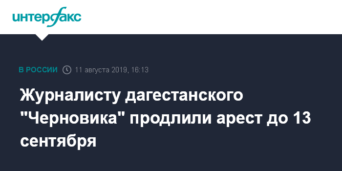 Москва. 11 августа. INTERFAX.RU - Советский районный суд в Дагестане продлил срок содержания под стражей журналиста "Черновика" Абдулмумина Гаджиева, сообщается в воскресенье на сайте издания.