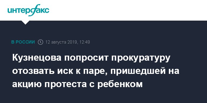 Москва. 12 августа. INTERFAX.RU - Уполномоченный при президенте РФ по правам ребенка Анна Кузнецова обратится в Генпрокуратуру с просьбой отозвать иск о лишении прав родителей, взявших ребенка на несогласованную акцию оппозиции в Москве.