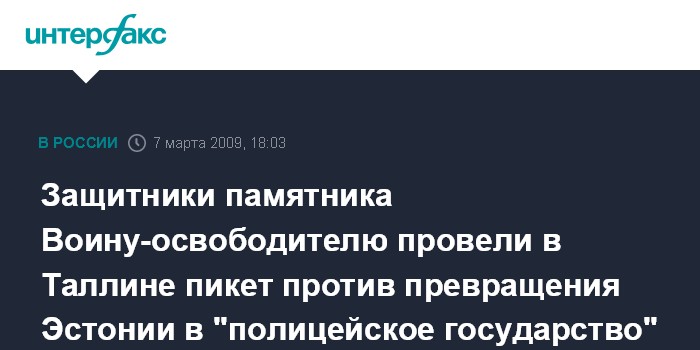 Москва. 7 марта. INTERFAX.RU - Общественная организация в защиту памятника Воину-освободителю Таллина от фашистов "Ночной дозор" провела в субботу в Таллине пикет, на котором участники протестовали против действий главы МВД Эстонии.