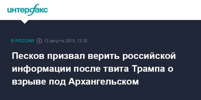 Москва. 13 августа. INTERFAX.RU - Пресс-секретарь президента РФ Дмитрий Песков призвал ориентироваться на информацию российской стороны в связи с заявлением президента США Дональда Трампа о том, что взрыв, произошедший на полигоне под Архангельском, имеет отношение к ракете "Буревестник".