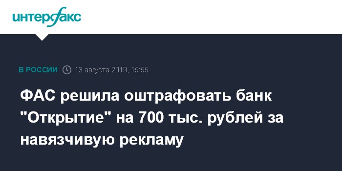 Москва. 13 августа. INTERFAX.RU - ФАС решила оштрафовать банк "Открытие" на 700 тысяч рублей за распространение ненадлежащей рекламы, следует из сообщения ведомства.