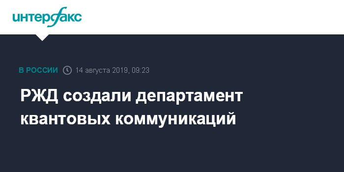 Москва. 14 августа. INTERFAX.RU - ОАО "Российские железные дороги" (РЖД) с целью развития высокотехнологичных квантовых технологий создали департамент квантовых коммуникаций. Об этом сообщили "Интерфаксу" в пресс-службе РЖД.