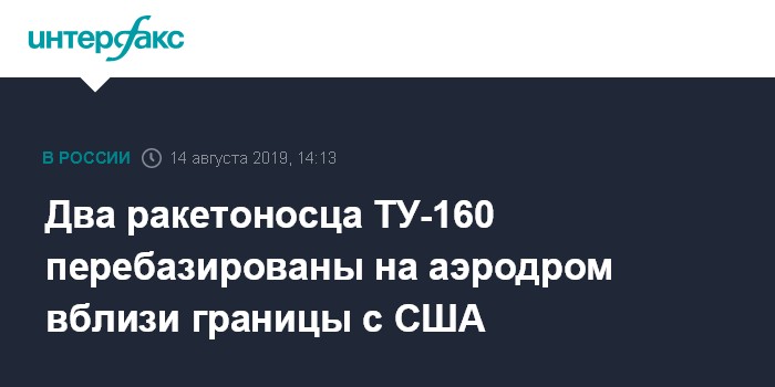 Москва. 14 августа. INTERFAX.RU - Два стратегических ракетоносца Ту-160 в ходе учения переброшены на аэродром "Анадырь" на Чукотке недалеко от морской границы России и США, сообщили в среду в департаменте информации Минобороны РФ.