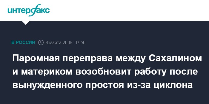 Южно-Сахалинск. 8 марта. ИНТЕРФАКС - ДАЛЬНИЙ ВОСТОК - Паромная переправа Ванино-Холмск, связывающая Сахалин с материком, возобновит свою работу предстоящей ночью, сообщили агентству "Интерфакс - Дальний Восток" в Сахалинском морском пароходстве.