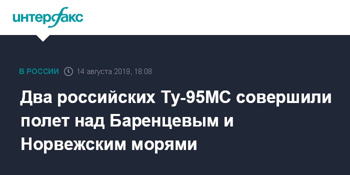 Москва. 14 августа. INTERFAX.RU - Два стратегических ракетоносца Ту-95МС выполнили плановый четырехчасовой полет над Баренцевым и Норвежским морями, сообщили в Минобороны РФ.